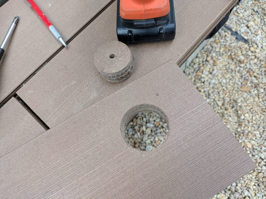 なんて考えて、単管パイプを立てられるよう通し穴をあけておく。