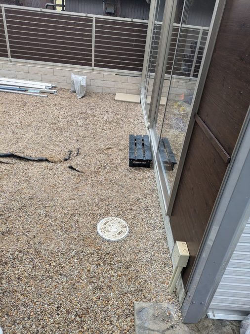 まずは束足を設置する部分の砂利をどけ、その下の防草シートをカット。