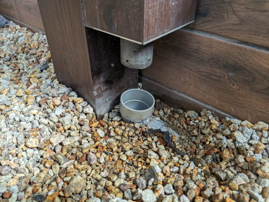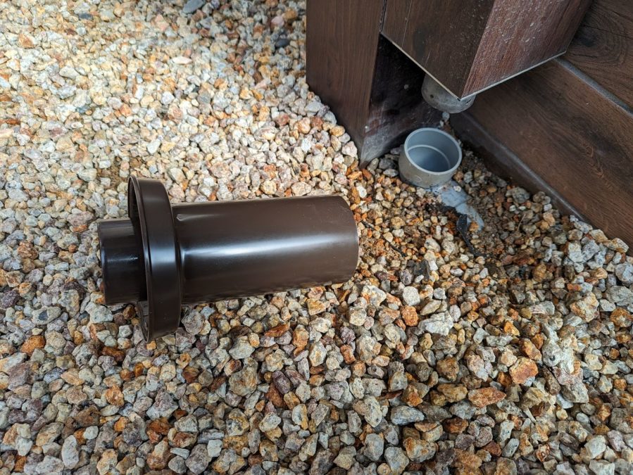 テラス屋根の雨どい排水部とその先のVP管エルボである。