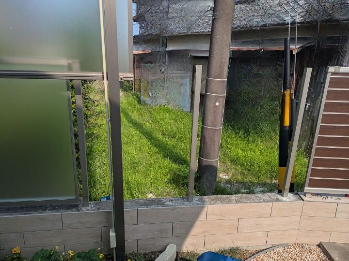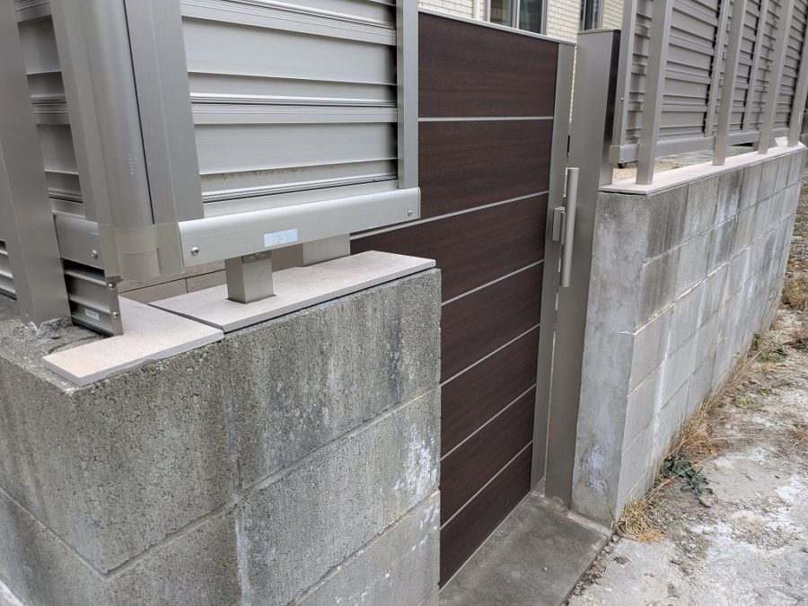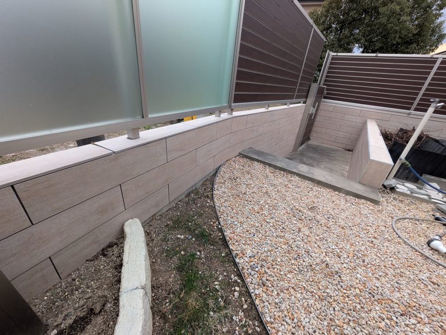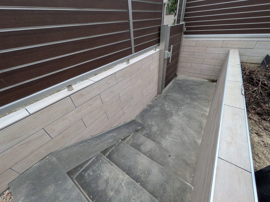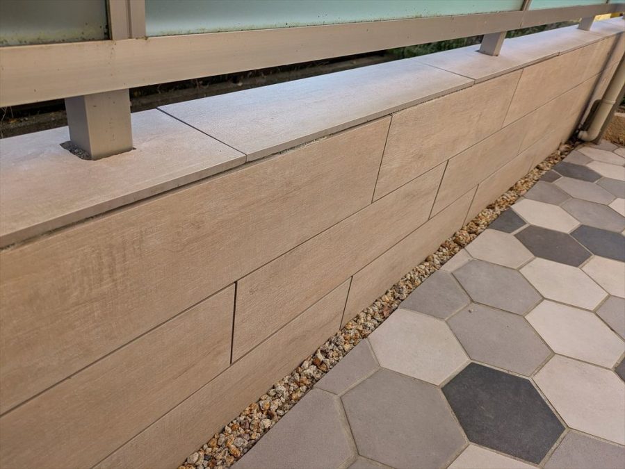 フェンス下に目隠し版を入れてる箇所は、手前部分のみタイルを貼ってます。