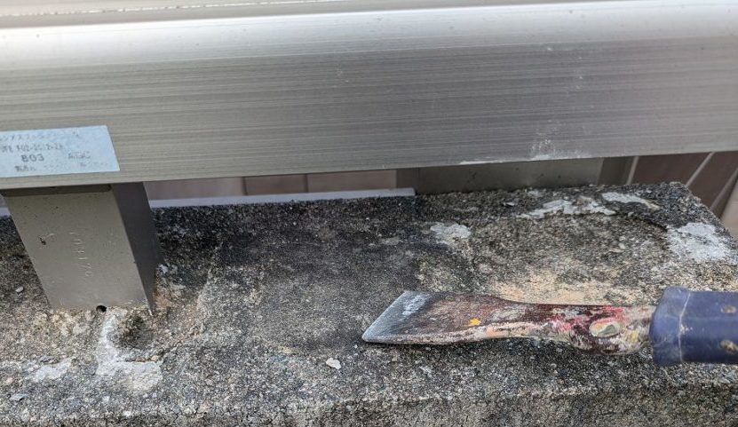 フェンスを立てる際に垂らしたのであろうセメントの塊などをタガネでこそげとっていく。
