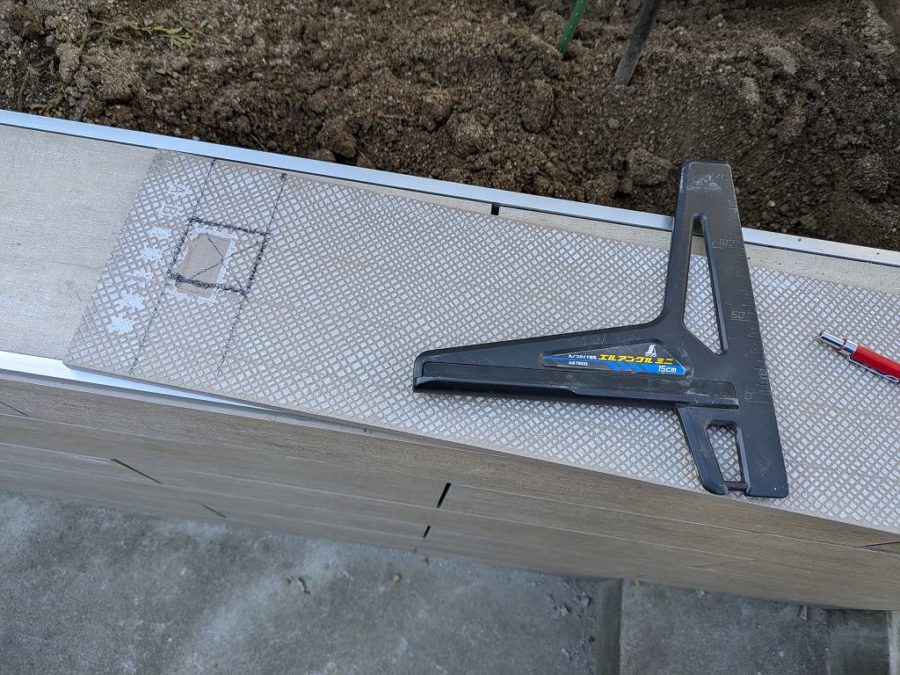 支柱部分を避けてタイルを貼るためには、タイルカットが避けられない。