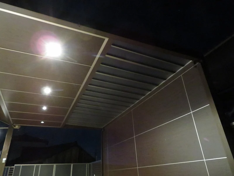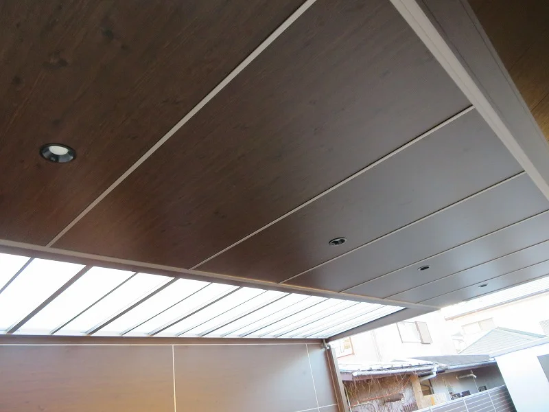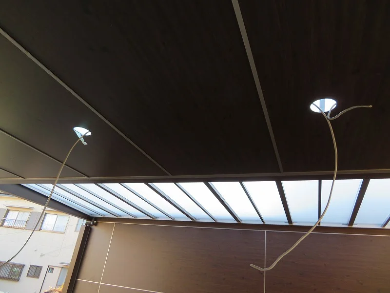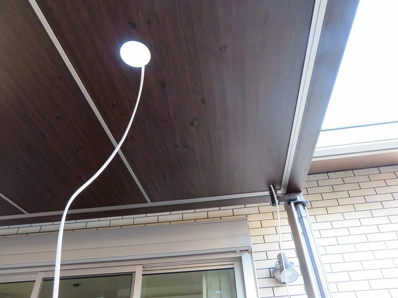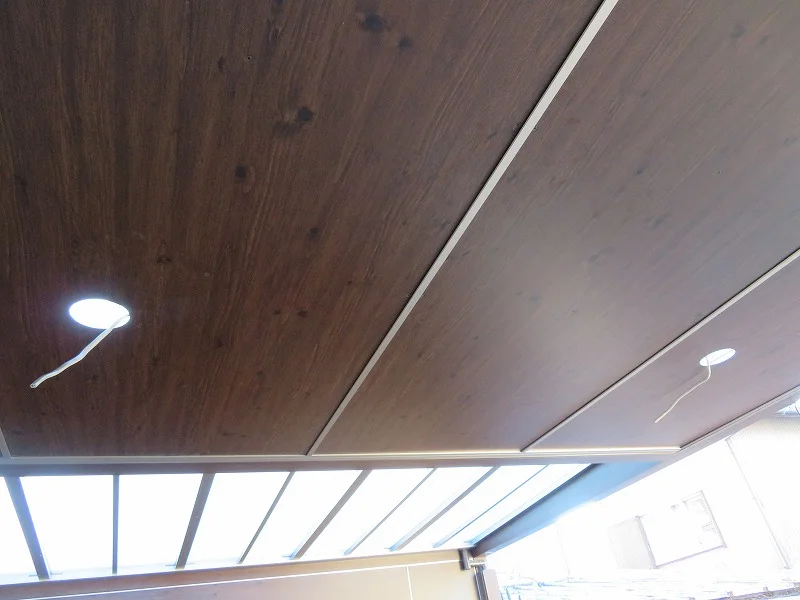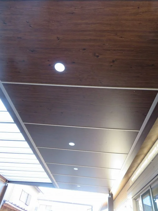 テラスにダウンライトを設置すべく、天井板に穴をあけた。