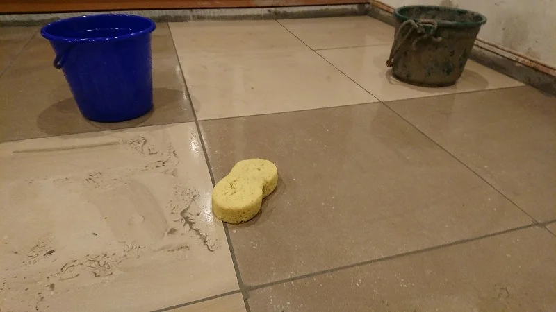 少し乾いたら、しぼったスポンジで余分な目地材を取り除く。