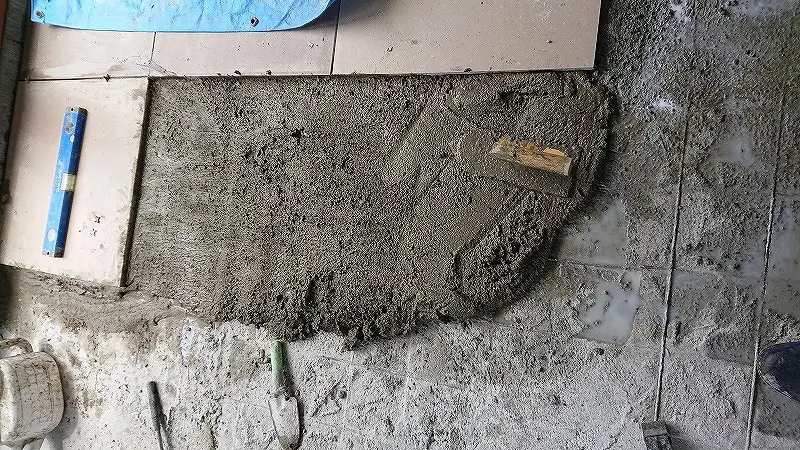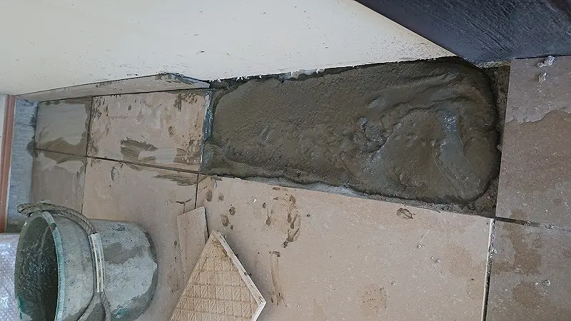 薄々気付いてたんだけど、セメント硬化後にタイルを叩いて打音確認したところ、内部空洞がありそうな高い音だったのでコリャだめだと確信。