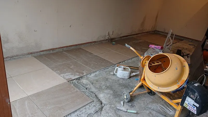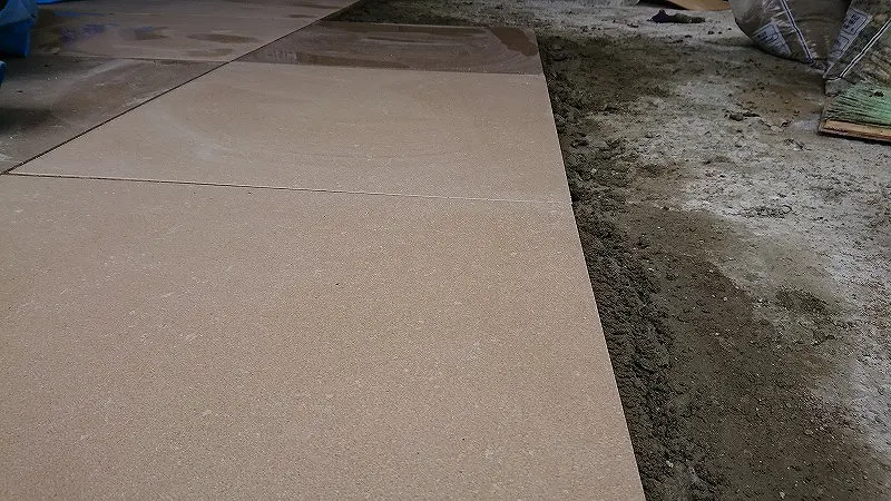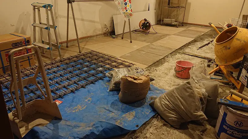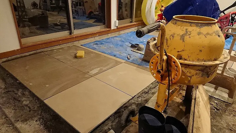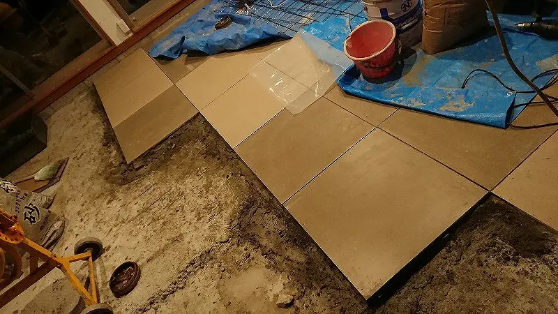 前回までに、ガレージ床にタイルを貼るための下準備が終わった。