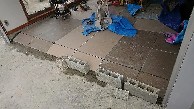 貼り付けモルタルが硬化するまでは、自重でタイルがズレるのを防止するためブロックで止めました。