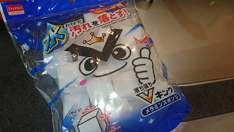メラミンスポンジと言えば、「激落ちくん」が有名だけど、今回使ったのは「落ち落ちVキング」(ダイソー)。