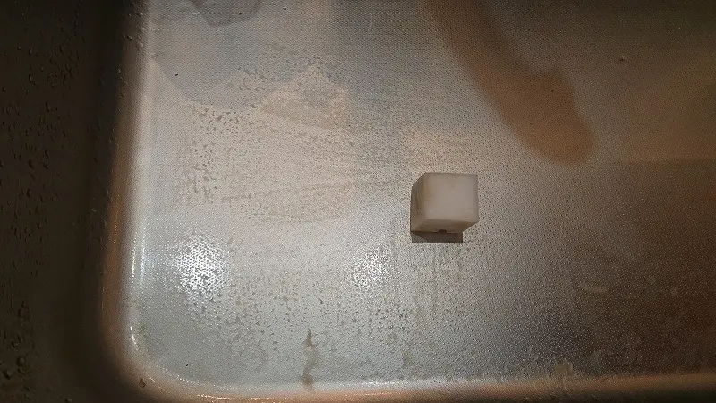 しかし、うちのシンクはコーティングがハゲてる状態であり、単に汚れを落とすだけでは不十分と考え、残っているコーティングをはがす覚悟で、メラミンスポンジを使用。
