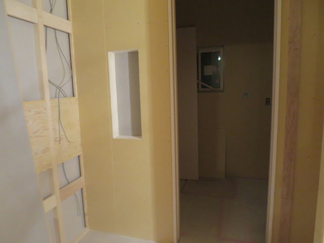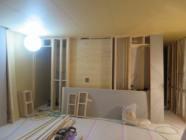 脱衣所は石膏ボードの施工が完了しており、今は洗面所に取り掛かっている状態。