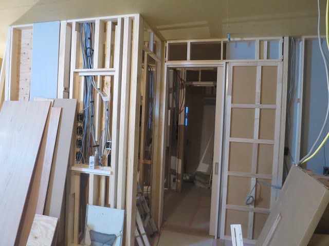 玄関部分も概ね石膏ボードの施工が終わっていた。