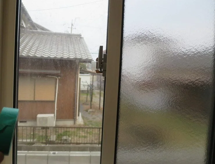 例えばこれ↓キッチン横の窓だが、なぜかスリガラスと透明ガラスの混在となっている。