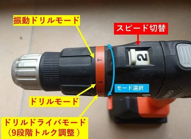 「振動ドリルモード」「ドリルモード」「ドリルドライバモード」の選択が可能なほか、回転速度も変更可能。