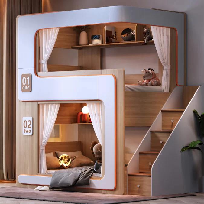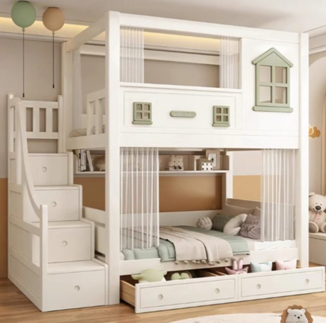 そんな視点でネット検索していると、、、そもそも2階部分が囲われているタイプのベッドを発見!